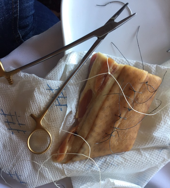 Jeg fikk meg et lynkurs i sutur av min far som er pensjonert kirurg siste morgenen hjemme. Jeg tror ikke jeg imponerte spesielt med mitt håndlag… Vi får krysse fingrer og tær om at jeg ikke får bruk for akkurat den kunnskapen! Vi har med mye strips!