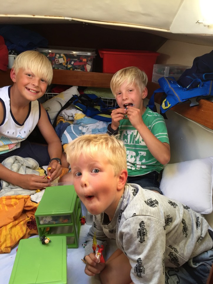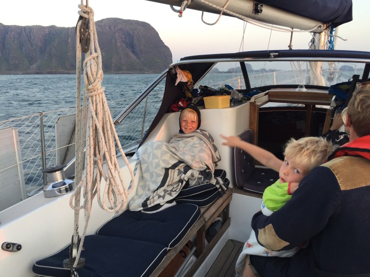 Gutta lekte med lego i forpiggen over Stavfjorden, noe som selvsagt førte til at de etterpå lå lett ugne i cockpit, de turnet i salongen (i alle fall enkelte av dem) og speidet på solnedgangen og på den norske hesten (Alden).