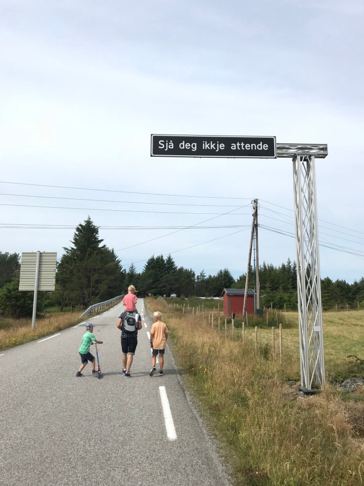 Dette skiltet står etter ferjekaia på Værlandet. Vi ser oss nok attende, men det er en god påminning om at vi nå må legge stress og pakking og alt vi ikke rakk bak oss og fokusere på at vi nå endelig er i gang! For det er jo tross alt bare et år vi er på tur, og vi vet jo innerst inne at det året kommer til å gå fortere enn vi ønsker.