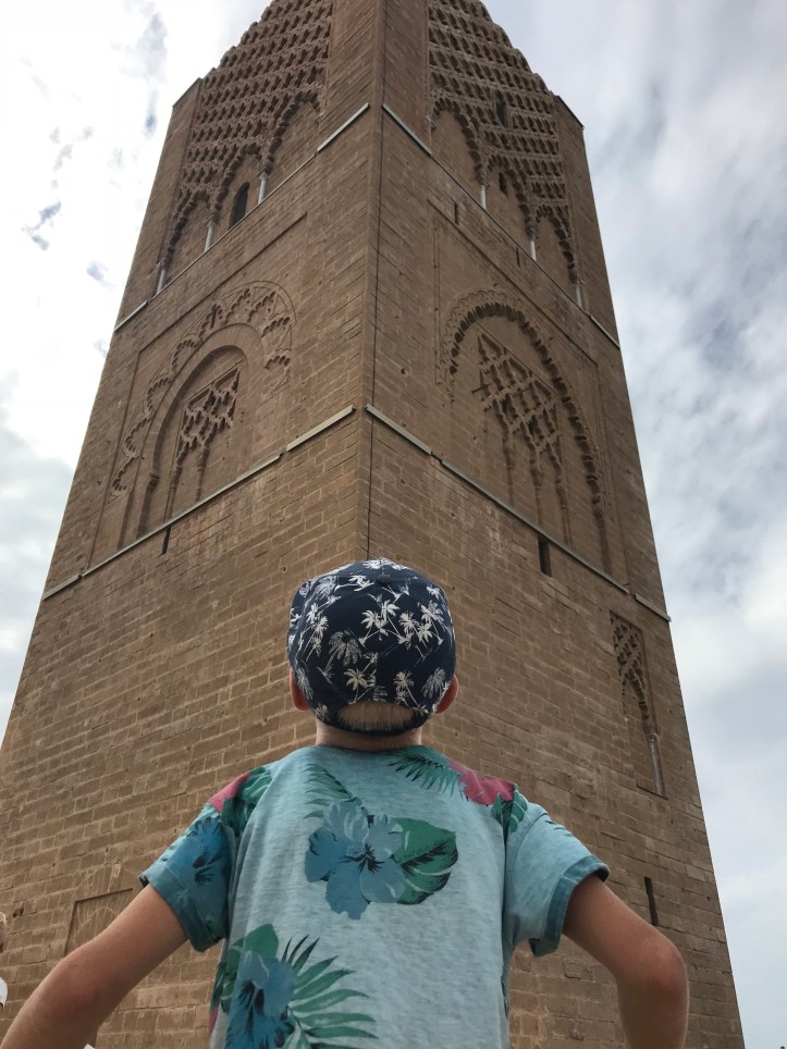 Fra båten har vi god utsikt over elven til Hassans tårn. En dag gikk vi for å ta det nærmere i øyensyn. Påbegynt i 1194 og planlagt å bli verdens høyeste minaret i det som skulle bli verdens største moské. Men da kalifen som sto bak planen døde i 1199, døde også den storslagne drømmen. Men Hassans tårn står der den dag i dag, sammen med søylene som skulle holde oppe moskeen, som en påminning om hva som kunne vært. Minareten er i daglig bruk og bønneropene bærer godt avsted over elven og bort til Sira på andre siden.