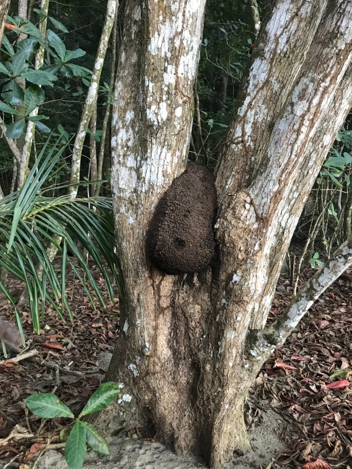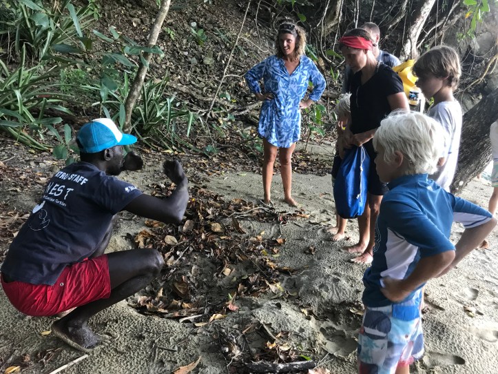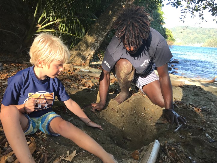 En ettermiddag drar vi på ekspedisjon med to skilpaddeguider. Planen er å lete etter skilpaddebabyer som er i ferd med å grave seg ut fra redet og hjelpe de på veien til friheten, men hellet er ikke helt med oss så vi finner bare allerede forlatte reder. Men det er likevel en lærerik tur.