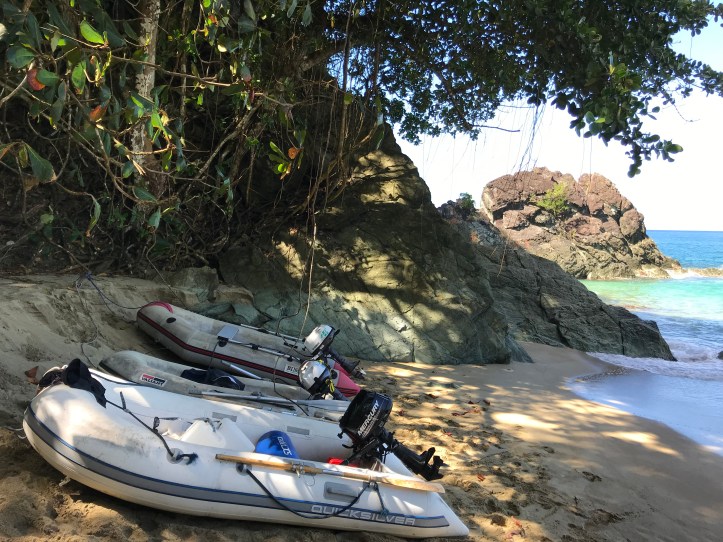 I bukta her yrer det av liv. Pelikanene stupdykker etter hoppende fiskestimer, svære svarte fregattfugler kretser høyt over oss, i jungelen skvaldrer papegøyene høylytt og på korallrevet svømmer fargerike fisker, murenene lurer i små huler og store rokker hviler seg på sandbunnen. Delfinene strømmer inn i bukten for å fråtse i småfisk og av og til titter et skilpaddehode opp av vannet før det forsvinner nedi dypet.