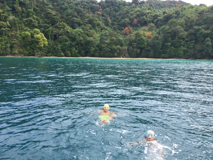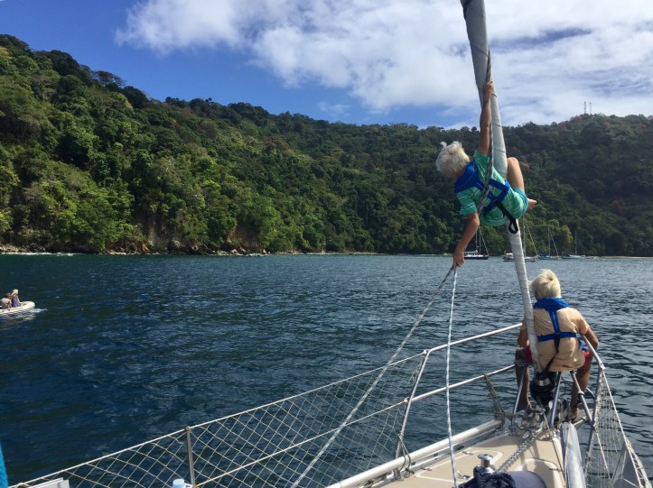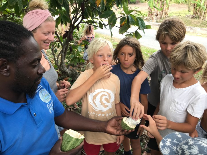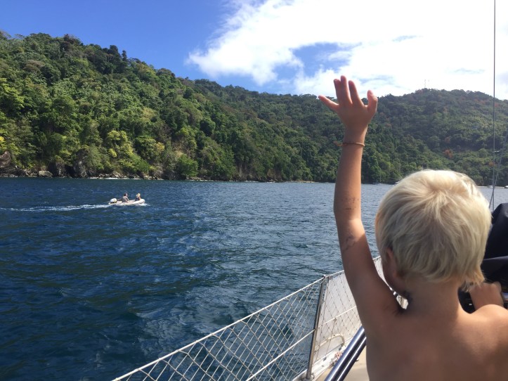 Det er fascinerende å se den grønne øya tre mer og mer tydelig frem etter som Sira fosser avgårde mot land etter de 16 dagene på havet. Dette er noe annet enn de tørre øyene på andre siden av havet! Grønt og frodig, jungelen strekker seg ned mot havet, og noen delfiner kommer innom for å ønske oss velkommen. Da vi runder inn i bukta med det spennende navnet Man of War bay ser vi en dingy med to kjente barn i, Valdemar og Sofie fra La Vie kommer for å ta oss i mot! Når de kommer på snakkeavstand bobler de over av alle de spennende tingene de har sett. Vi føler allerede at dette var det riktige stedet å slippe anker for første gang i Karibien.