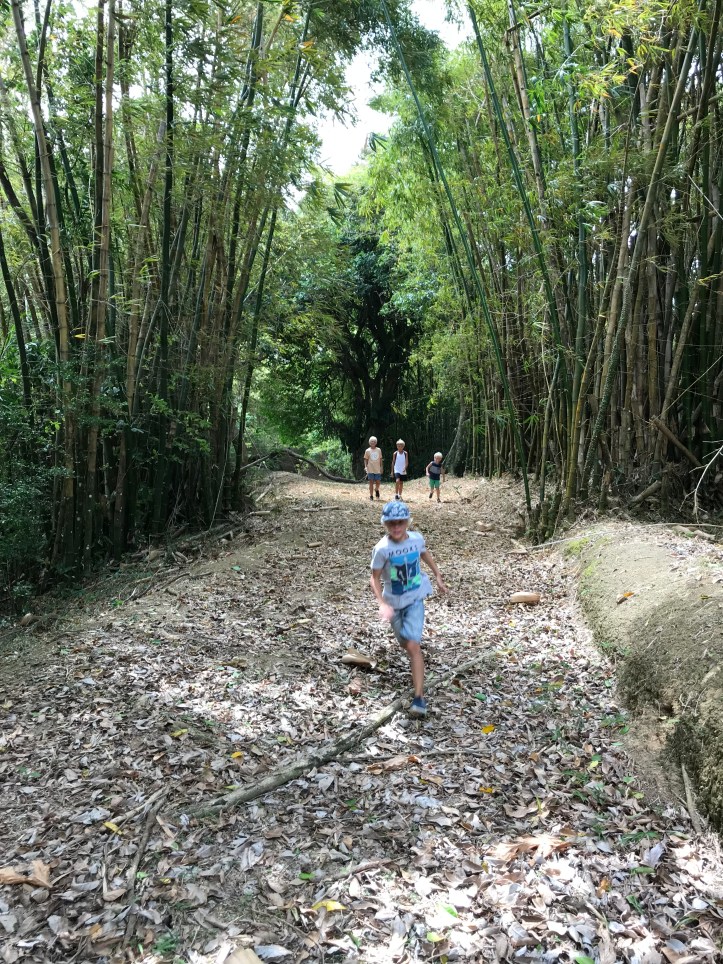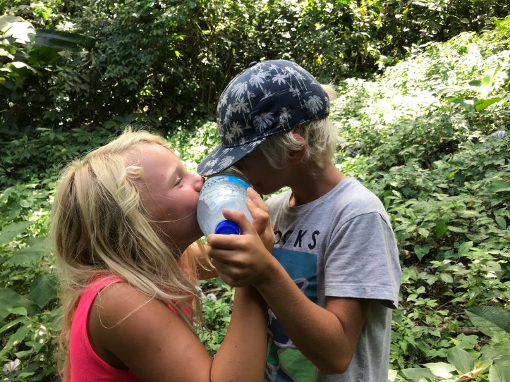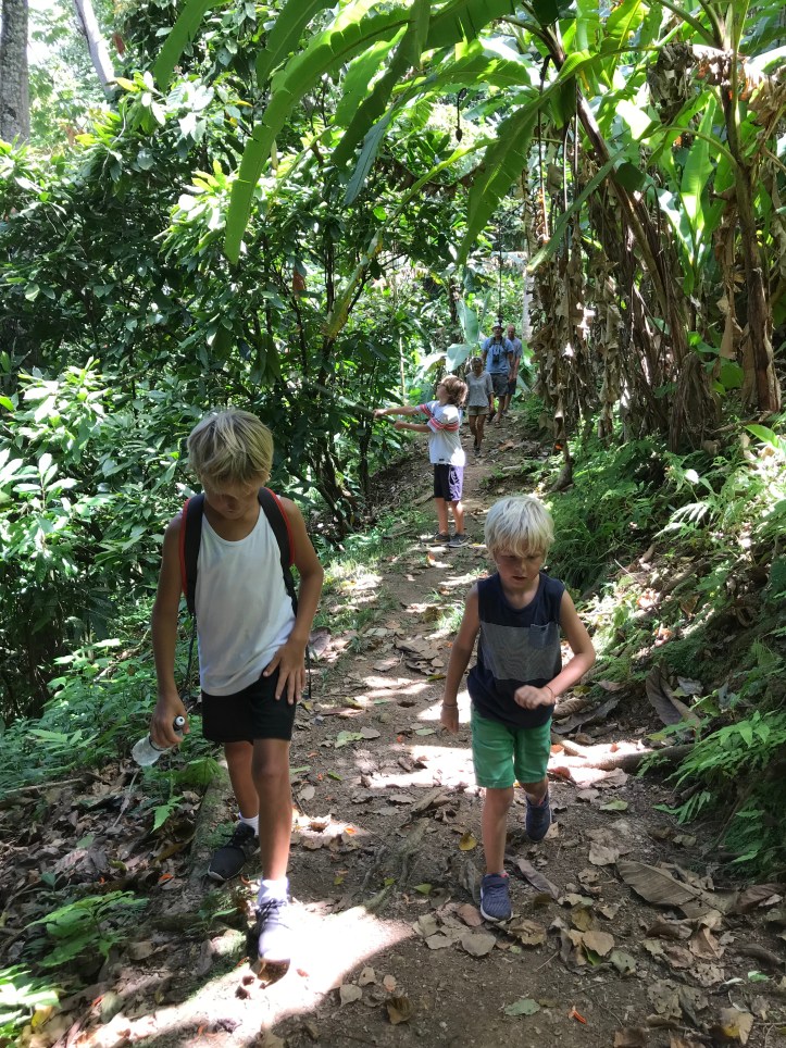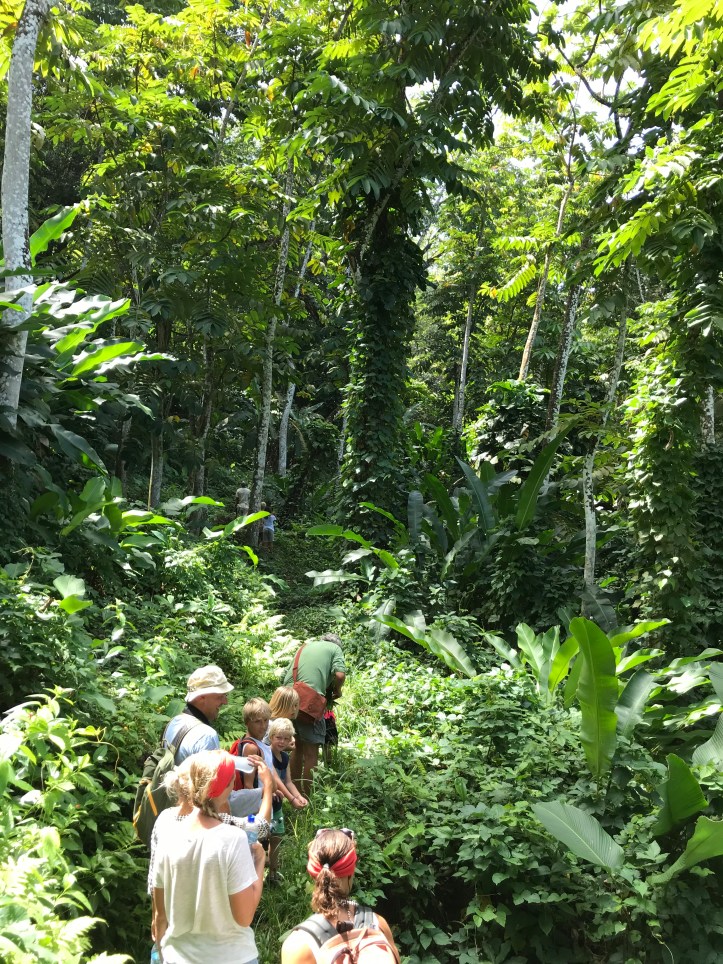 På gåturen opp til vannfallet lærer vi litt om plantene vi går forbi, her ser ungene nærmere på det fascinerende gummitreet.