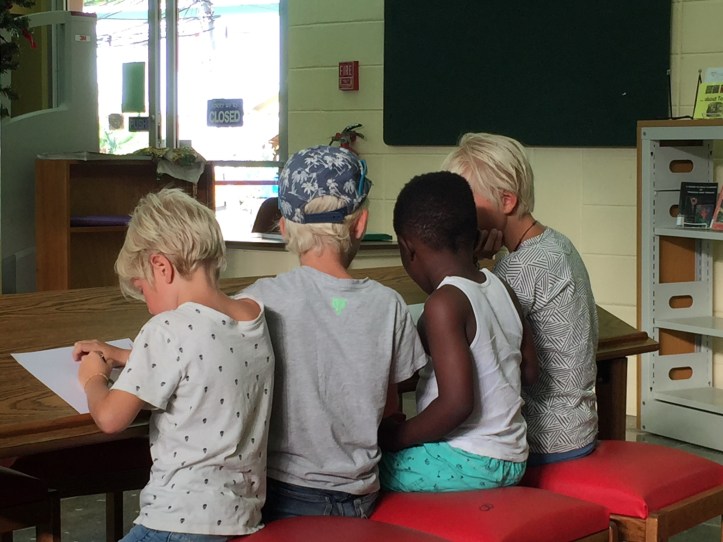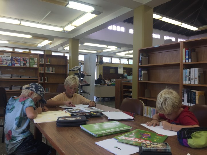 Deilig med aircondition avkjølt klasserom når det er 30 grader på båtskolen. Det blir nesten som en liten grendaskole her når Sira, Katja, La Vie og etter hvert Leontina også tilbringer formiddagene med skoleaktiviteter her. Vi får oss lånekort og kan ta med ekstra spennende bøker hjem til Sira. Engelsktimene går som en lek!