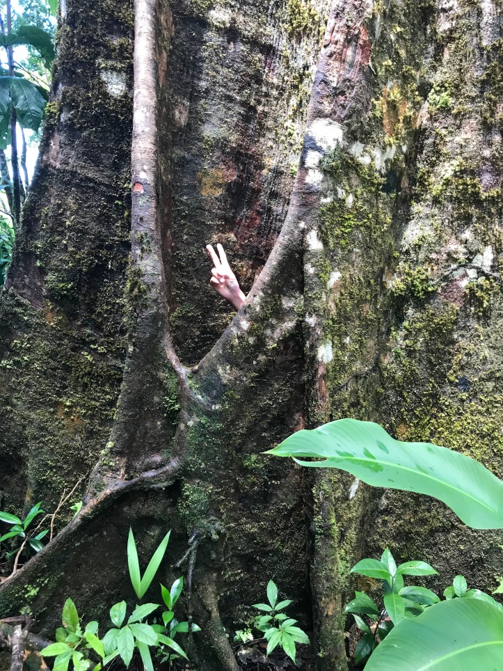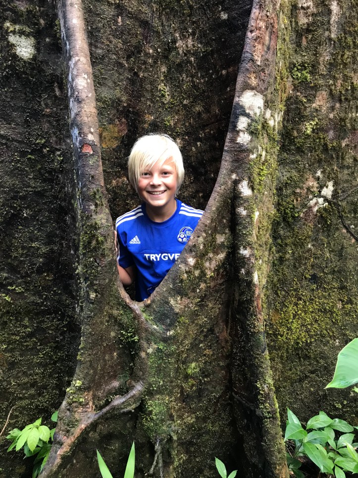 Trygve gjemmer seg i stammen av et tre. Guiden forteller at indianerne som levde på øya (Dominica er for øvrig en av få karibiske øyer der det fremdeles en en liten indiansk befolkning igjen) pleide å gjemme seg i disse trærne når noen var etter dem.