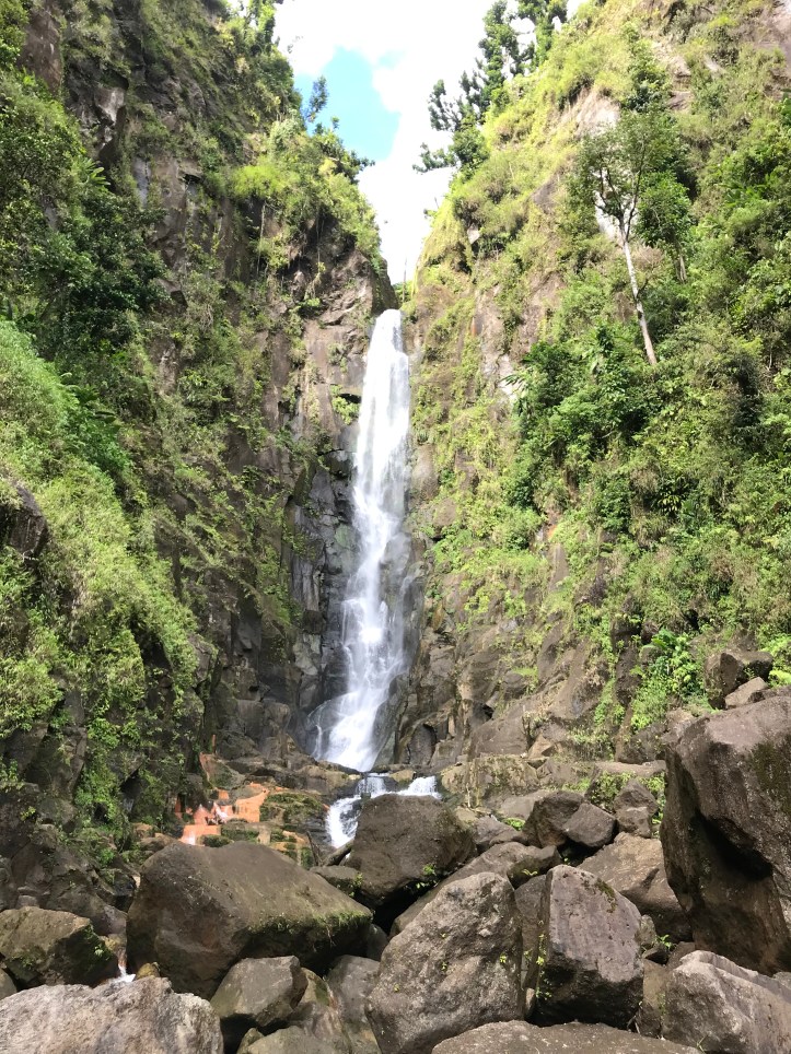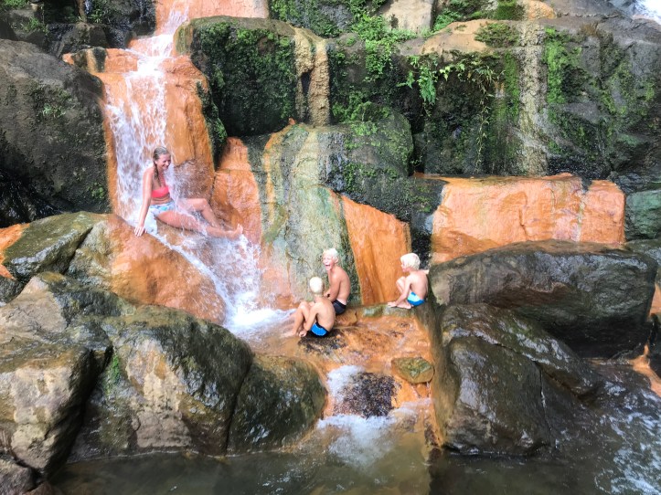Vårt siste stopp er kanskje turens mest fascinerende – Trafalgar falls, vakre i seg selv, i enden av en frodig dal. Men det fascinerende ligger i det varme vannet som strømmer ut av fjellet på venstre side av fossen. Vannet her holder 55 grader, mens på høyre side er det kjølig fjellvann. Du kan stå med en fot i det varme vannet og en i det kalde, eller ta en kald dusj i fossen til høyre og så flytte deg til fossen på venstre side og bli gjenoppvarmet med gloende varmt vann. Det er utrolig deilig, og bare en overveldende naturopplevelse. Trygve og jeg klatrer også opp til bassenget på toppen ved fossen. Seacat guider oss nedenfra med plystring og vink så vi tråkker rett, for her er det både bratt og sleipt. Her oppe kan man flyte rundt med jungelen rundt seg, de bratte klippeveggene tårnende over og fossen dundrende i ørene. Selve bassenget ender i en fantastisk utsikt. Som det vakreste naturlige evighetsbasseng.