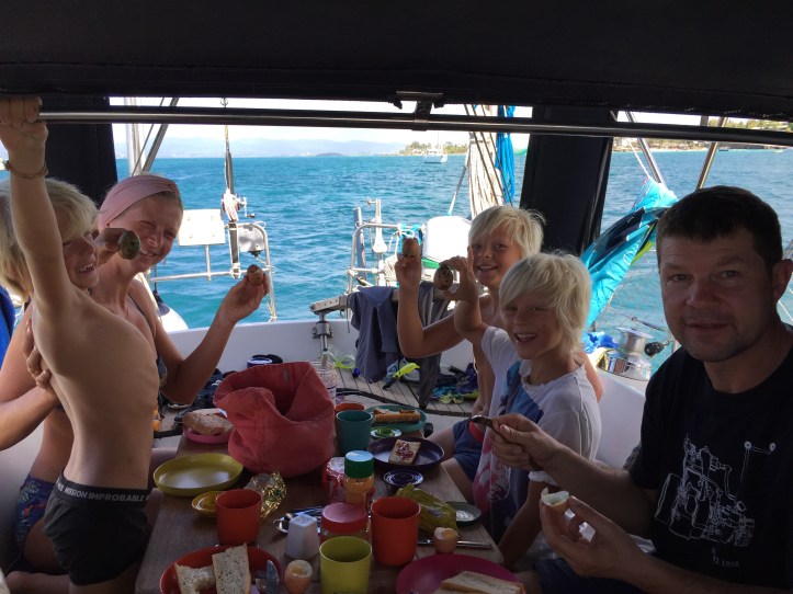 Vi hadde jo også fått en viktig bursdagsinvitasjon, de gode kompisene til gutta – Casper og Christopher, fra Katja ble 11 år og inviterte til feiring på andre siden av øya, der Katja lå på anker med La Vie og Borea. Og det måtte vi jo bare få med oss!